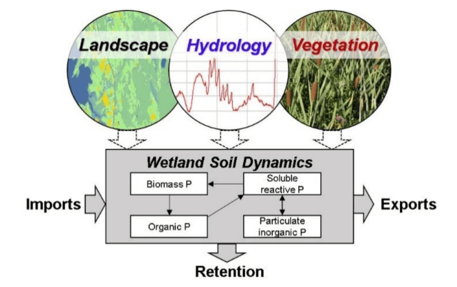 The model indicated a function of wetlands to serve as a buffer to change in soluble reactive phosphorus concentrations. As upstream soluble reactive phosphorus concentrations decreased in modeling scenarios, wetlands sediments released more soluble reactive phosphorus to come into equilibrium with incoming waters. This has important implications for understanding watershed-scale restoration and management to reduce phosphorus loading.