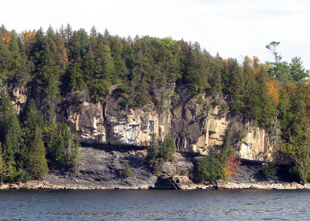 Around 440–350 million years ago, tectonic forces closed the Iapetus Ocean. Continental collisions during the Taconic and Acadian Orogenies pushed and deformed the region’s rock layers. One visible sign of this geologic stress is the Champlain Thrust Fault, a line running from Quebec to the Catskill Plateau in New York, where the older rock was pushed over younger rock. The Islands were less affected due to their location to the west of the fault, but some of the rocks beneath the islands were tilted or uplifted during this time.