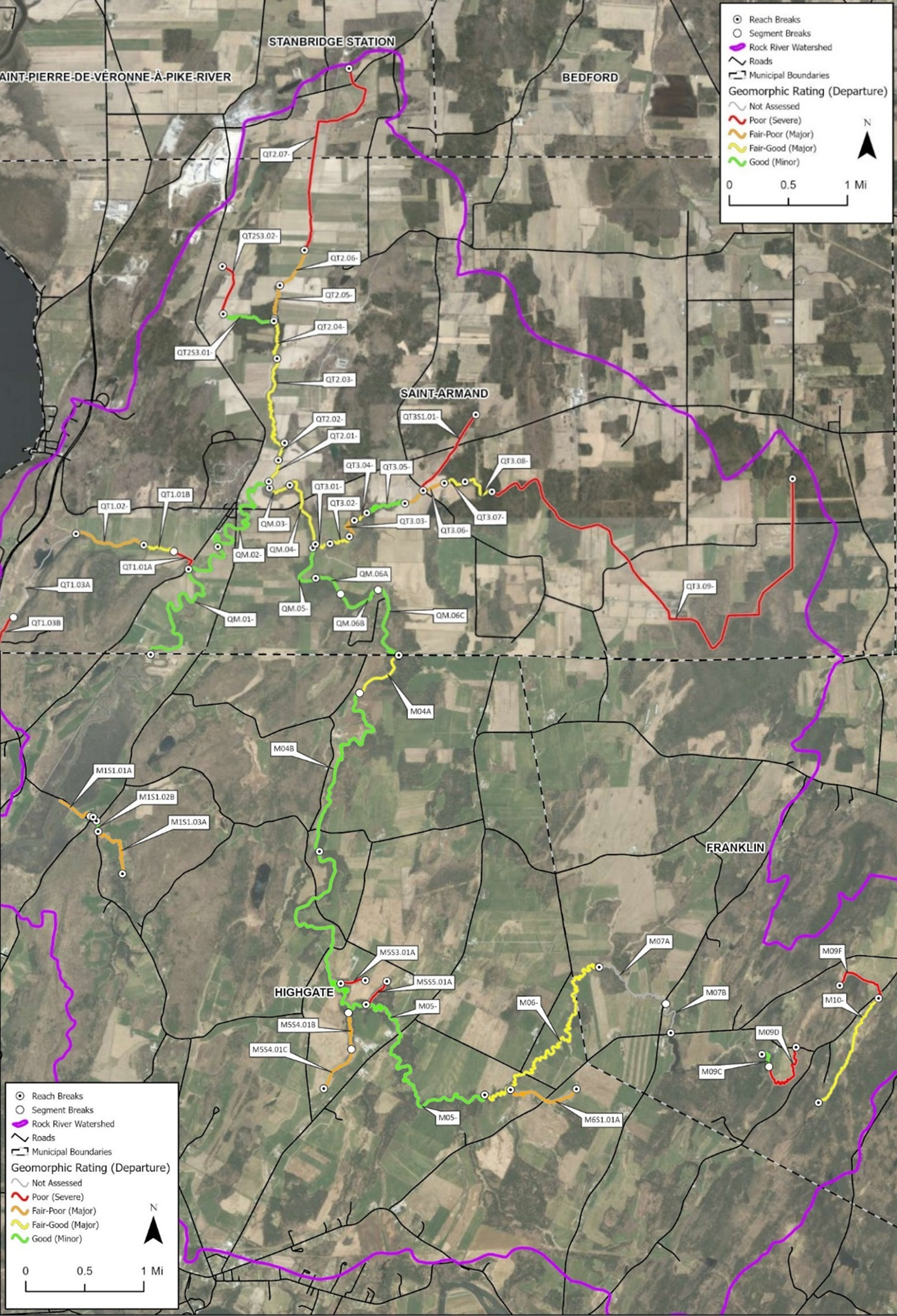 Data collection was conducted in two phases, following Vermont SGA protocols. Phase 1 used GIS, remote sensing, and high-level field assessments to identify significant channel features to develop watershed scale data about the landscape and channel features. Results from Phase 1 identified stream reaches that required more detailed, Phase 2 analyses. Phase 2 data was collected in the field, documenting the physical conditions streams to inform potential river restoration projects, river corridor planning, and flood mitigation efforts. Twenty-eight reaches were recommended for Phase 2 assessments in Quebec, and VTDEC had previously conducted Phase 2 assessments on 19 reaches in the Vermont portion of the watershed, which were reassessed for this project.