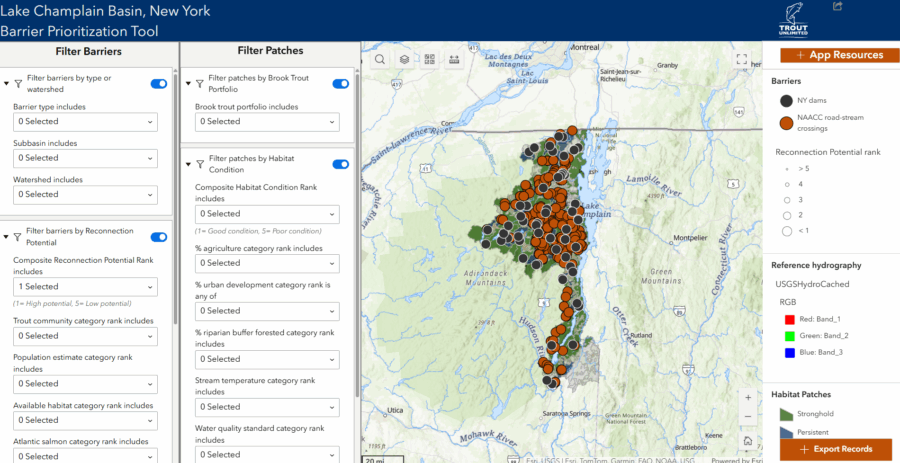 Reconnecting and restoring streams by removing barriers to aquatic organism passage (AOP) reduces the risk of flooding and erosion and allows species, like landlocked Atlantic salmon and Eastern brook trout, to access critical habitat. In this project, Trout Unlimited (TU) developed a web-based tool that prioritizes sites for AOP restoration projects, like dam removal and culvert replacement, in the New York portion of the Lake Champlain Basin (LCB). Prioritization is based on the potential ecological benefits, improvements to public safety, and the likelihood of community support. The tool focuses restoration work on feasible sites that provide the greatest ecological value.